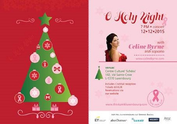 A charity fundraising concert featuring Irish soprano Celine Byrne, organised by ThinkPinkLux, will be held on Saturday 12 December 2015 at 20:00 at the Centre Culturel Scheiss (142 Val Sainte-Croix, L-1370 Strassen).