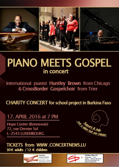 Details: A benefit Gospel concert is being organised on sunday 17 April 2016 at 19:00 at the Hope Centre (72 Rue Dernier Sol, L-2543 Luxembourg-Bonnevoie), featuring Huntley Brown, pianist from Chicago, USA, and the Cross Border Gospel Group from Trier.