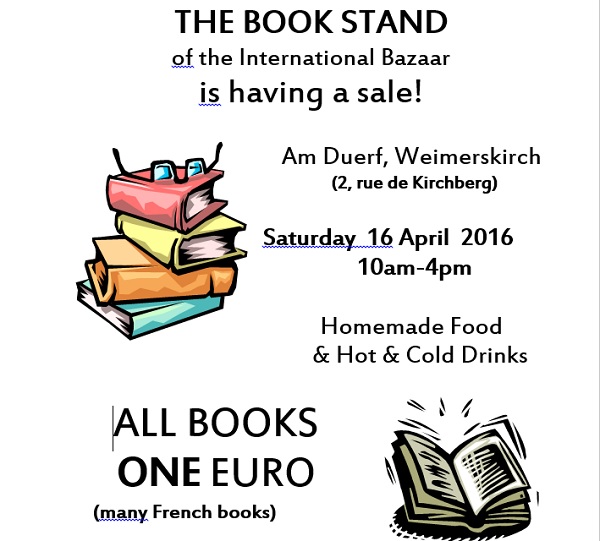 The Book Stand of the International Bazaar will hold the next Book Sale at Am Duerf, 2 rue de Kirchberg in Weimerskirch on Saturday 16 April 2016 from 10:00 - 16:00.