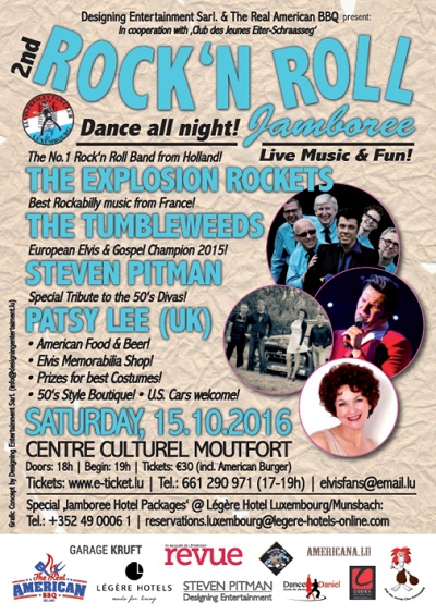 Details: On Saturday 15 October, Luxembourg-based Elvis impersonator Steve Pitman will perform at the 2nd Rock 'n Roll Jamboree at the Centre Culturel in Moutfort alongside The Explosion Rockets (#1 rock 'n roll band from The Netherlands), The Tumbleweeds (Rockabilly from France) and Patsy Lee (a special tribute to 1950s divas from the UK)