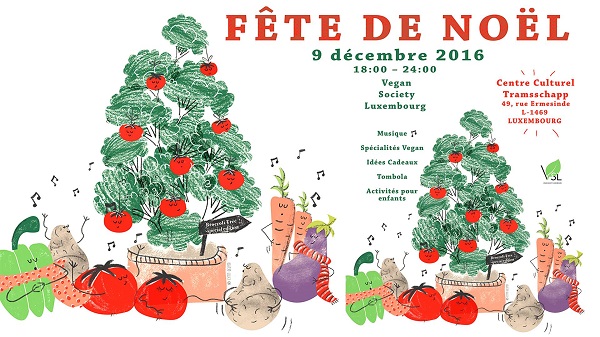 Details: On Friday 9 December the Vegan Society Luxembourg a.s.b.l (VSL) will hold their second Fete de Noel at the Tramschapp cultural centre in Luxembourg-Limpertsberg (49 rue Ermesinde).