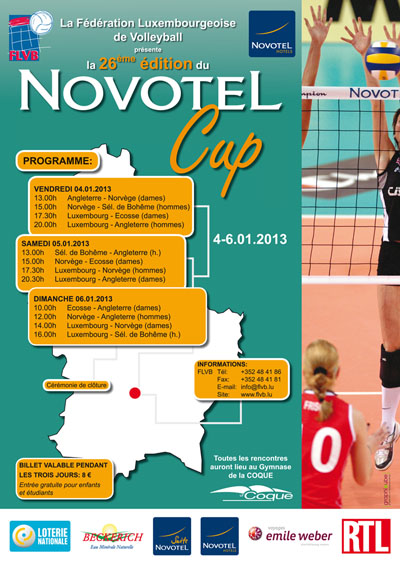 Details: The 26th annual Novotel Cup, organised by the Luxembourg Volleyball Federation, takes place this week-end at the Coque in Kirchberg. The competition starts today at 13:00, with both men's and women's competitions, with teams representing England, Scotland, Norway, West Bohemia and Luxembourg. Schedule: Friday 04.01.2013 13:00 England – Norway (women) 15:00 Norway – West Bohemia (men) 17:30 Luxembourg – Scotland (W) 20:00 Luxembourg – England (M) Saturday 05.01.2013 13:00 West Bohemia – England (M) 15:00 Norway – Scotland (W) 17:30 Luxembourg – Norway (M) 20:30 Luxembourg – England (W) Sunday 06.01.2013 10:00 Scotland – England (W) 12:00 Norway – England (M) 14:00 Luxembourg – Norway (W) 16:00 Luxembourg – West Bohemia (M) Followed by the Awards and closing ceremony Venue: the Coque Organiser: Luxembourg Volleyball Federation Price: Entry (3-day pass): €8 (children & students free) Ticketing: at the door URL: More info: www.flvb.lu Info: