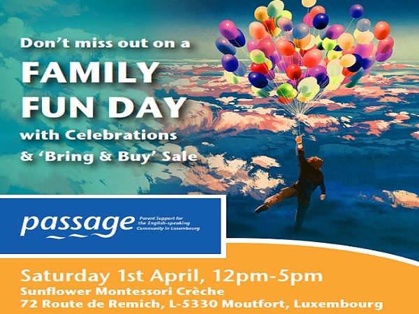 Details: Passage's (Parent Support for the English-speaking Community in Luxembourg) 'Bring & Buy' Birthday Bash will take place on Saturday 1 April 2017 at the Sunflower Montessori Creche, from 12:00 to 17:00.