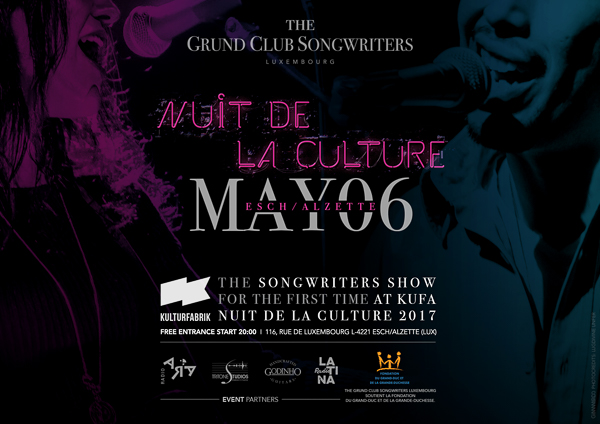 Details: The Grund Club Songwriters Show — Summer Edition — is at the part of “La Nuit de la Culture 2017”. On the evening, Josh Oudendijk will be inducted as the new singer-songwriter, and the show will also feature Daniel Balthasar, Lata Gouveia, Priscila da Costa, Kevin Heinen, Sitta, Susan Breuers and Kid Colling who will be hosting the event. Special guests include Ernie Hames on trumpet and David Ascani on saxophone. The Grund Club Songwriters will perform 18 songs written in Luxembourg, many of them re-arranged by the Grund Club Band (Sven Sauber, Tom Heck, Gilles Bernard and Luca Sales) especially for this show.