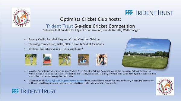Details: This coming week-end, Saturday 1 and Sunday 2 July, the Optimists Cricket Club will be hosting the Trident Trust 6-a-side Cricket Competition at the cricket ground in Walferdange (1 rue de l'Alzette).