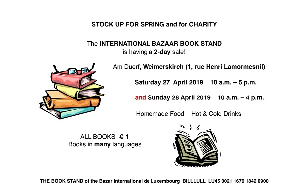On Saturday 14 and Sunday 15 March 2020, the Book Stand of the Bazar International de Luxembourg a.s.b.l. will be holding its traditional Spring Fundraiser book sale at the "Am Duerf" Cultural Centre in Weimerskirch (1 Rue Henri Lamormesnil): CANCELLED.