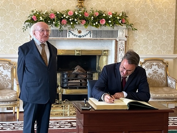 The official delecation them made its way to Phoenix Park on the north side of the city where Prime Minister Bettel was received by the President of Ireland, Michael D Higgins, at his official residence, the Aras an Uachtarain (President's building) for an official meeting. Prime Minister Bettel signed the distinguished visitor's book, mentioning that it is the 50th anniversary of Ireland joining the EU and the 62nd anniversary of diplomatic relations starting between the two countries. Informally they discussed the learning and speaking of Irish on a daily basis, before having a private meeting.