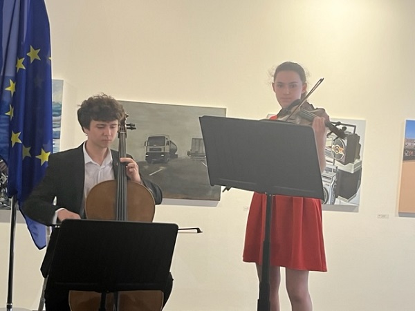 At the start of the reception, the two national anthems, as well as Beethoven's 9th symphony, were performed by Sarah Brazil on violin and Adam Joyce on cello, garnering loud applause and cheers from those invited.