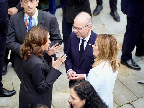 (L-R) Kamala Harris, Vice President of the United States; Luc Frieden, Prime Minister of Luxembourg; Roberta Metsola, President of the European Parliament;
