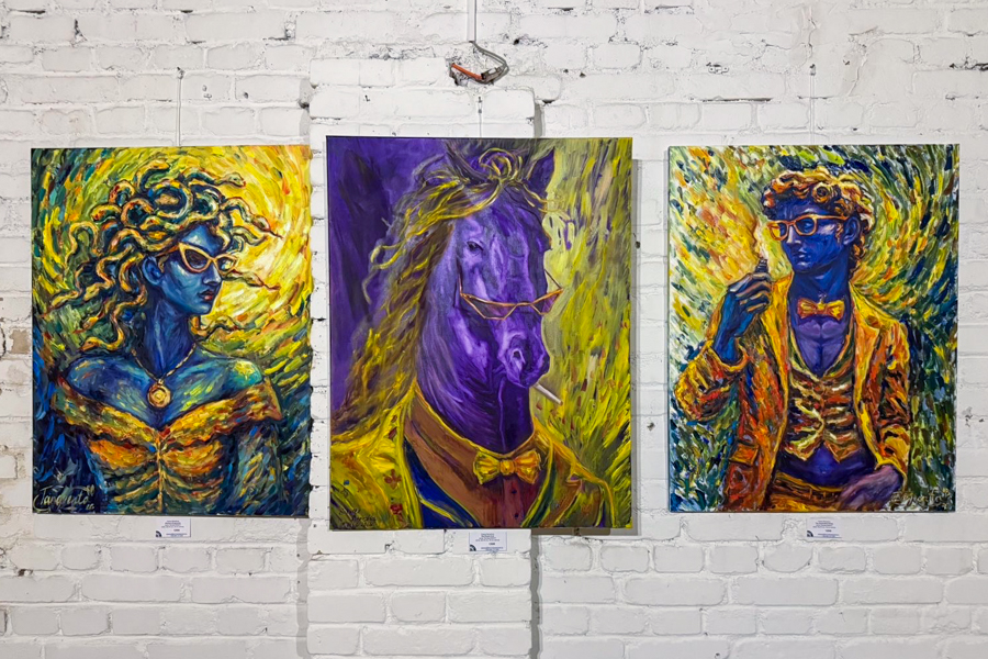 Oxana Berezhna’s works stand out for their bold colour palettes and layered symbolism. Trained in physics before pursuing art, she combines a structured approach with expressive visual language. Her creative process often involves exploring the same composition through several colour schemes. The exhibition includes one of her most recent works, completed shortly before the opening. Her paintings reference classical motifs, including Michelangelo’s David and Medusa Gorgon, which she reinterprets in a contemporary and often surreal context alongside the recurring horse motif.