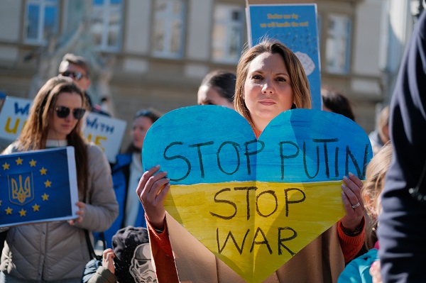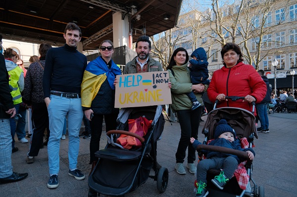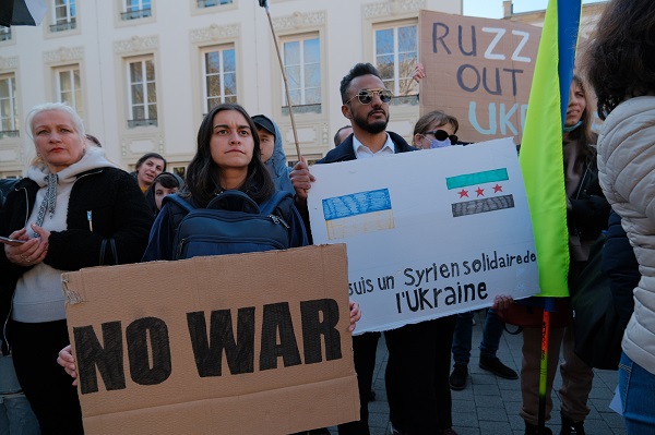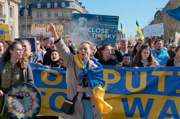 Protesters wore the national colours of Ukraine (blue and yellow) and waved Ukrainian, Luxembourgish, European and other flags in solidarity with the Ukrainian people. Several people also carried signs with slogans such as "Stop Putin, stop war", "Close the sky", "Peace for Ukraine" and "Mothers in Russia rise for peace".