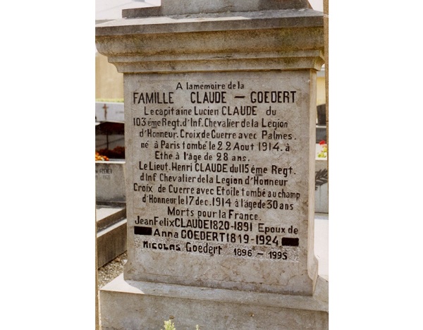 Today, the main thing of interest is to be found in the cemetery: one of the very few World War One monuments and the tomb of people who fought and were killed in the French army. The tomb monument (pictured) is for two men of the same family. The first is Captain Lucien Claude of the 103rd Infantry Regiment and decorated with the Légion D’Honneur and the Croix de Guerre avec Palmes. He was born in Paris and died on 22 August 1914 at Ethe (the first major battle of the war and the start of the Battle of the Frontiers). The second is Lieutenant Henri Claude of the 115th Infantry Regiment who died on 17 December 1914, decorated with the Légion D’Honneur and the Croix de Guerre. He died on 17 December 1914 at Maricourt, Somme.