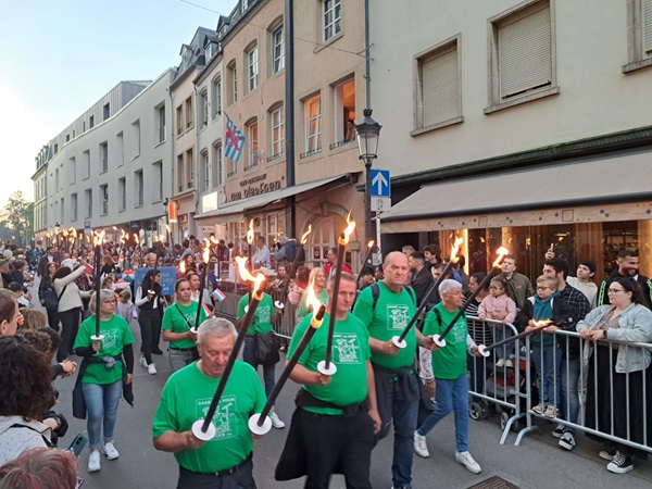The Changing of the Guard at the Grand Ducal Palace took place in the afternoon, officially beginning the celebrations of that evening. A torchlit parade, Fakelzuch, also went through Luxembourg City, from Place du Théâtre to Place Guillaume II; multiple organisations and local groups, such as sport clubs and bands, took part in walking together holding the lit torches.