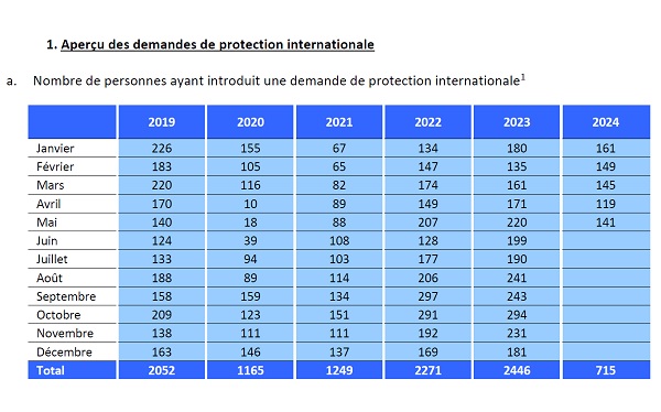 A total of 141 people applied for international protection in Luxembourg in May 2024, up from 119 in April 2024. In the first five months of 2024, Luxembourg received a total of 715 applications for international protection - down from 867 received during the same period in 2023.
