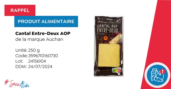- uncooked firm cheese Cantal Entre-Deux AOP (250 g) from the Auchan brand, with the expiry date 24/07/2024 and sold between 7 June and 4 July 2024.