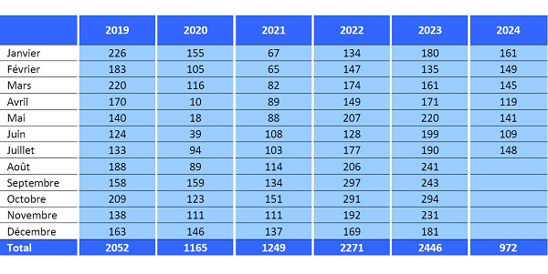 204 decisions on asylum applications were taken in June 2024, with 61 applicants being granted refugee status (53 in May). In July, 230 decisions were taken, with 79 applicants receiving refugee status.