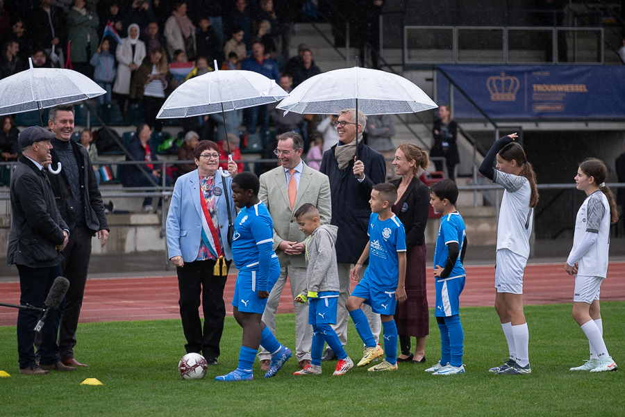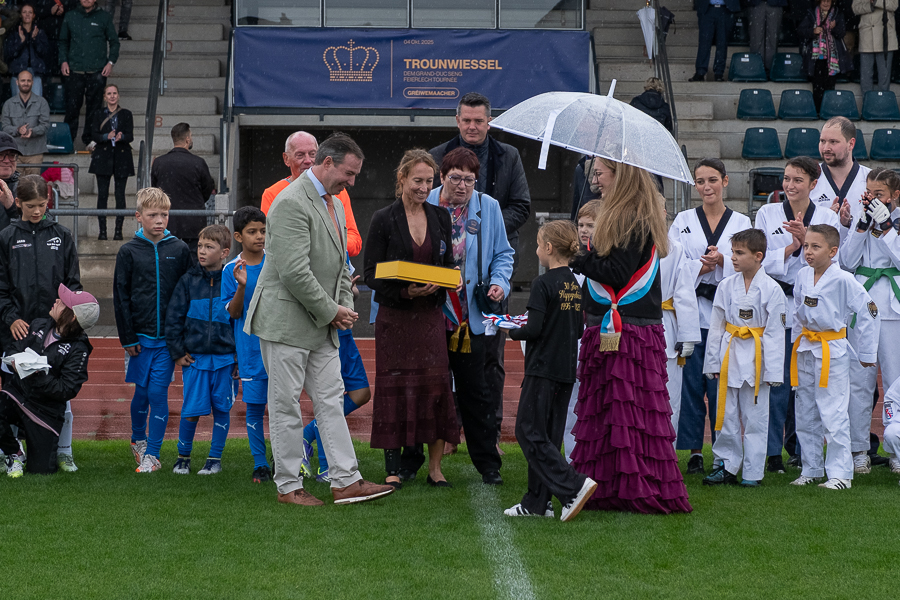 Children active in football and athletics guided the Grand Duke around the pitch. Inside the stadium, about 100 young players were training. Local clubs representing athletics, handball, taekwondo, football and table tennis were present. Grand Duke Guillaume exchanged with volunteer trainers, referees and club presidents, posed for a group photo on the pitch and received a symbolic gift at the end of his visit. A public reception was planned afterwards.
