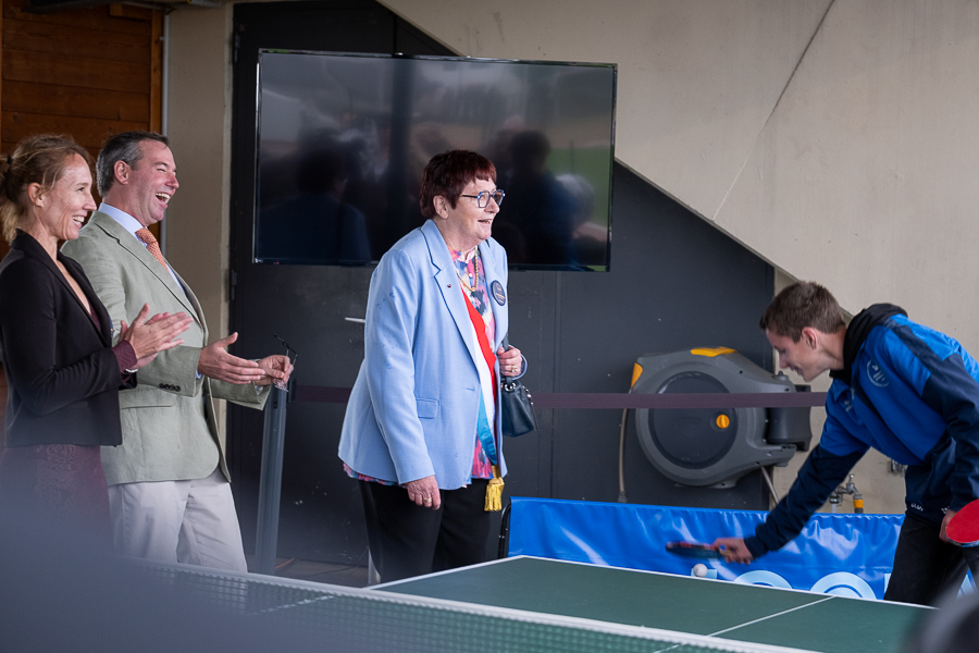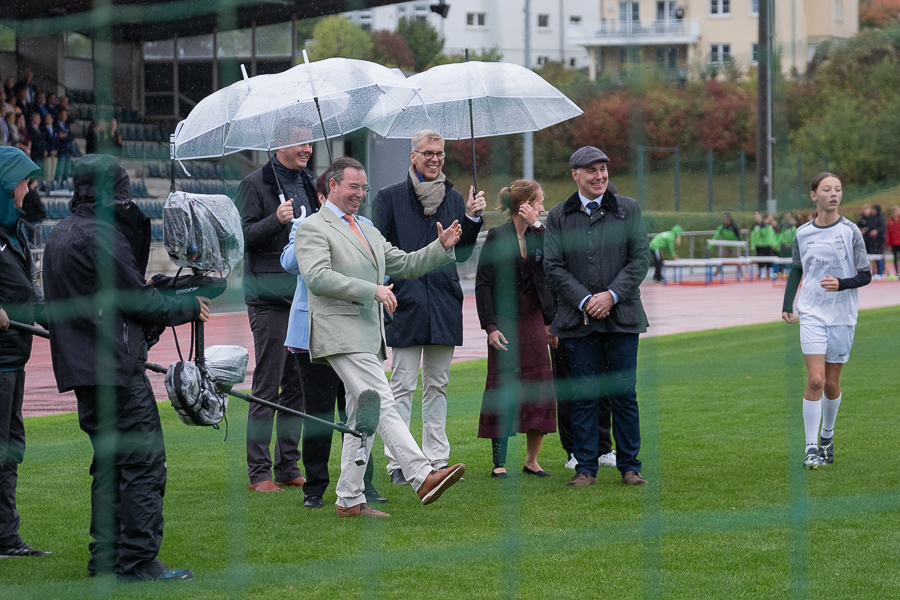 The tour began in Grevenmacher in eastern Luxembourg around 12:30. Grand Duke Guillaume was welcomed at the “Op Flohr” stadium by Luxembourgish retired tennis player Anne Kremer, Mayor Monique Hermes and other local officials, along with Luxembourg’s Minister of the Economy, SMEs, Energy and Tourism, Lex Delles, the Minister for Home Affairs, Léon Gloden, and Moselle “Wäikinnigin” (Wine Queen) Jill Wagner.