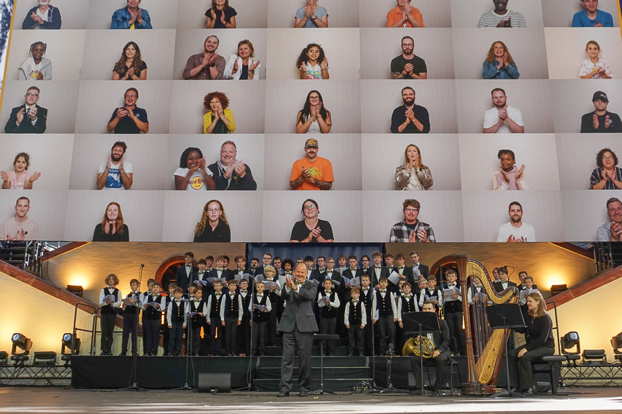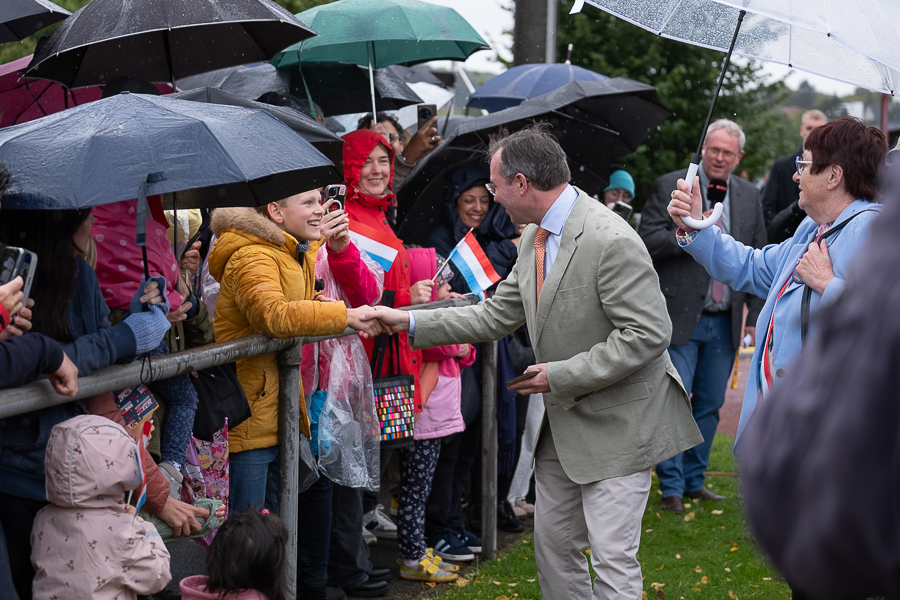 At Wiltz Castle, the Grand Ducal family were welcomed by table tennis champion Ni Xialian and writer Mike McQuaide (“An American in Luxembourg”), Mayor Carole Weigel and municipal officials, Luxembourg’s Minister of Agriculture, Food and Viticulture, Martine Hansen, and the Minister for Culture, Eric Thill, as well as invited guests, local association representatives and randomly selected Wiltz residents. Hundreds of people gathered at the amphitheatre to watch an inclusive theatre performance by “com-guck”, an interactive video projection from the “Schwätz mam Grand-Duc” (Speak with the Grand Duke) project and music from the Pueri Cantores youth choir and Naomi Aye & Band. The musicians performed a specially composed collaborative final piece before the Grand Ducal couple received another symbolic gift. The festivities continued in Wiltz after their departure around 15:30.