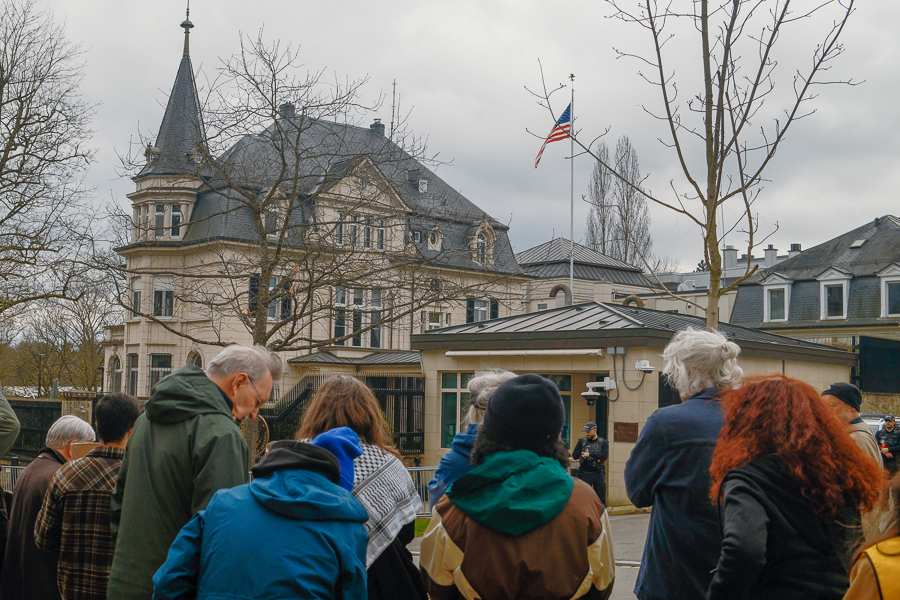 Around 30 people gathered for a demonstration outside the US Embassy in Luxembourg-Limpertsberg around midday on Tuesday 10 March 2026.
