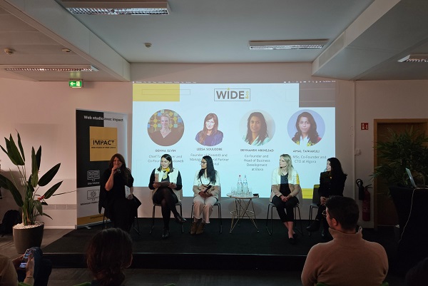 Following her introduction, Marina Andrieu invited the panellists up to the stage. These were: Genna Elvin, Chief Tada Officer and co-founder of Tadaweb; Reyhaneh Niknejad, co-founder and Head of Business Development at Elora; Amal Tawakuli, co-founder and CTO at Algora; Leesa Soulodre, founder of Planet43 and Managing General Partner at R3i Capital.