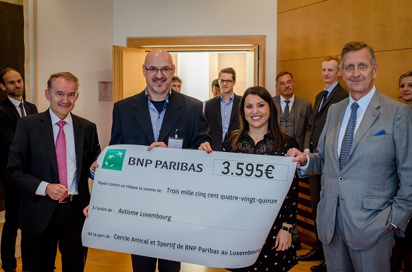 During a ceremony organised on 27 September 2017, Carlo Thill, Country Head of the BNP Paribas Group and Chairman of the Management Board of BGL BNP Paribas, and Marc Lenert, a member of the Management Board of BGL BNP Paribas and Chairman of the Cercle Amical et Sportif of BNP Paribas in Luxembourg, presented a cheque for €3,595 to Marc De Geest, Director of Autisme Luxembourg.