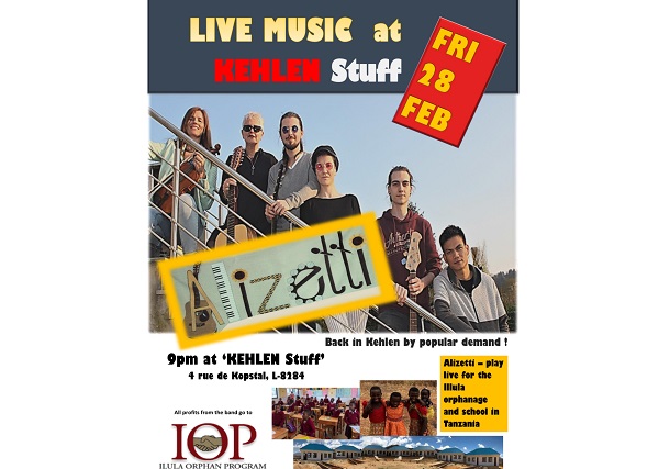 On Friday 28 February 2020, the band Alizeti will play a charity gig at the Kehlen Stuff (4 Rue de Kopstal, L-8284 Kehlen) from 21:00.