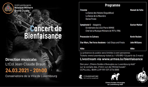 This year's concert is in favour of the guide dogs non-profit organisation "Chiens Guides d'Aveugles au Luxembourg Asbl". Those wishing to support this association are invited to make a donation via bank transfer to the "Frënn vun der Militärmusek" account: CCPLLULL: IBAN LU19 1111 1371 3776 0000.