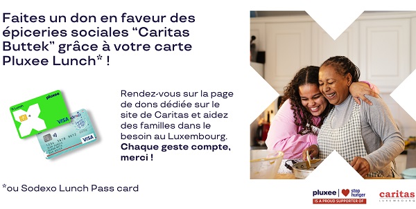 For 2024, Pluxee Luxembourg is preparing a new stage in its solidarity commitment with Caritas, with the launch of a 100% digital action. Holders of Pluxee Lunch cards will be able to make a donation via the dedicated page of the Caritas website by providing their first and last name and email address. The donation will be made in the same way as a traditional online transaction with the Pluxee Lunch card.
