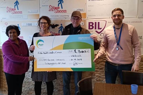 The Stëmm vun der Strooss organisation that supports the homeless and vulnerable members of society has reported that its Ettelbruck team recently received a visit from representatives of Schungkëscht Asbl, who supported the Stëmm's activities with a generous cheque for €1,800.