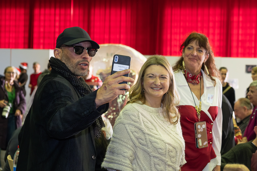 Guests were already queuing outside the venue shortly before midday, with the hall filling up over lunchtime. They were served a hot meal consisting of pumpkin soup and stuffed chicken with roast potatoes and vegetables, followed by a festive yule log for dessert. Tea, coffee and soft drinks were available throughout the afternoon, and attendees were welcomed on arrival with a glass of "Pink Snow Punch".