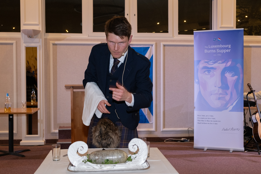 The address to the haggis is the centrepiece of every Burns supper, involving a designated speaker reciting the Burns’ poem “Address to a Haggis” directly to the traditional Scottish dish before it is served up as part of the main meal. A theatrical and energetic rendition of the poem was undertaken by James Dunn, previous winner of the Luxembourg marathon. This highly entertaining part of the evening was met with rapturous applause upon completion. The haggis was then escorted back to the kitchen to be prepared for consumption.