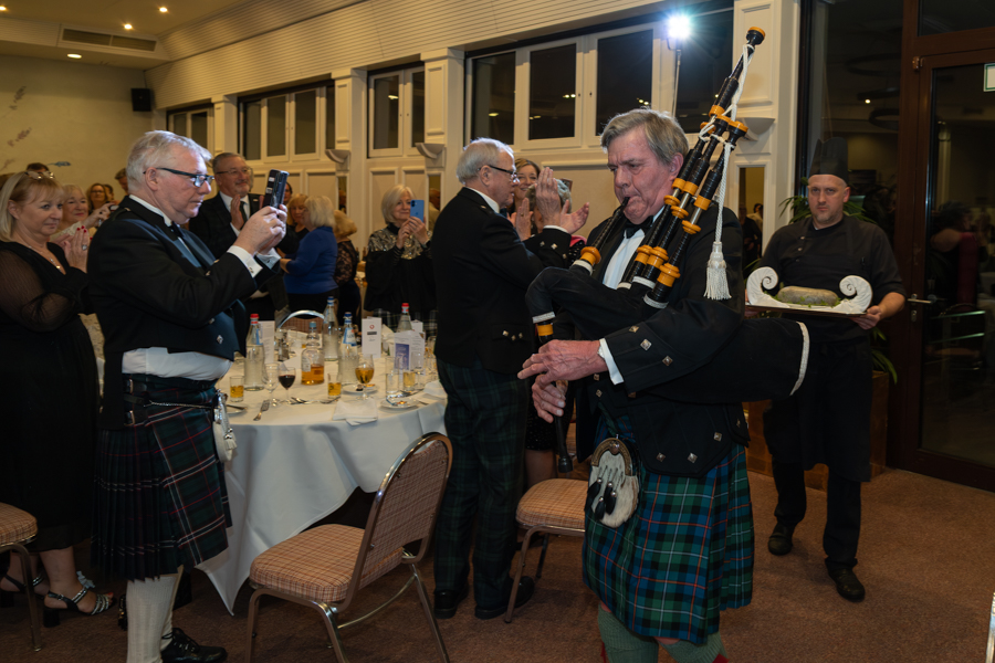 A packed room saw 114 people in attendance to celebrate the birthday of Scotland's national poet, Robert Burns (born 25 January 1759; died 21 July 1796). Many of the men had adorned the traditional Scottish kilt, with the ladies adding flashes of tartan to their evening dresses as they showed their respect for Rabbie, the “Plowright Poet”, a reference to his humble beginnings on the farms of Ayrshire in southern Scotland.