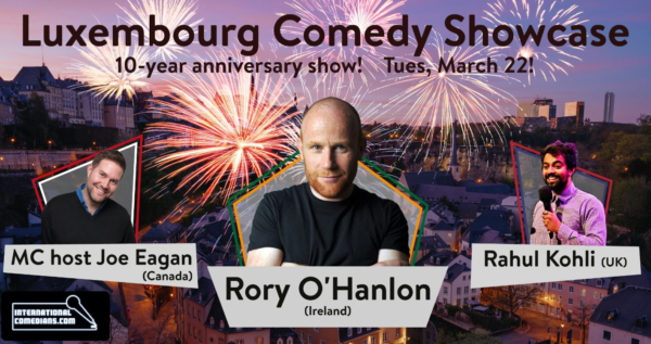 Luxembourg Comedy, Joe Eagan Comedy Productions and InternationalComedians.com have announced that their English-language 10-year anniversary comedy showcase will take place on Tuesday 22 March 2022 at 20:00 at Restaurant-Cafe Marionnette in Luxembourg-Gare (15 Rue de Strasbourg, L-2561).