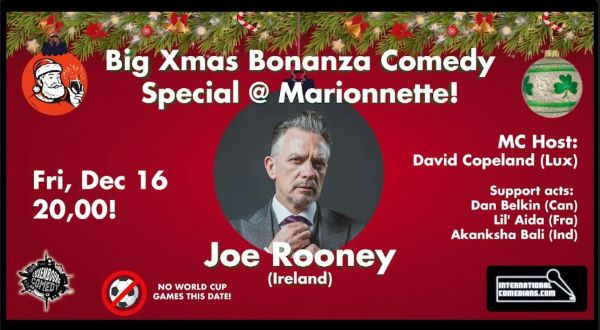 Luxembourg Comedy, Joe Eagan Comedy Productions and InternationalComedians.com have announced that a Christmas Bonanza Comedy Special in English will take place on Friday 16 December 2022 at 20:00 at Restaurant-Cafe Marionnette in Luxembourg-Gare (15 Rue de Strasbourg, L-2561).