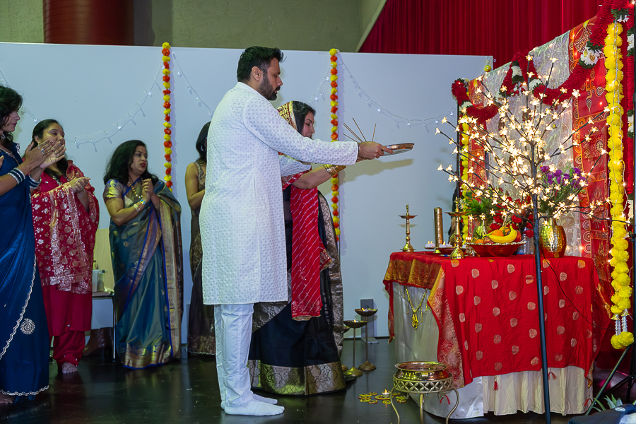 The event commenced with a Puja ceremony in which many couples and families offered prayers, as well as flowers, food and water, and which can also include other symbolic gestures expressing reverence and devotion.