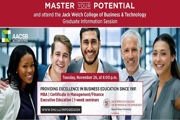 The Jack Welch College of Business of the Sacred Heart University (SHU) in Luxembourg has announced that it is holding an MBA Information Session on Tuesday 26 November 2019 at 18:00 at the Chamber of Commerce (Training Centre) in Luxembourg-Kirchberg.