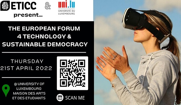 The University of Luxembourg has announced that it is organising, together with Europe Technology & Collective Intelligence for Citizens (ETICC), the first edition of the European Forum for Technology & Sustainable Democracy, which will be held on Thursday 21 April 2022 at the Maison des Arts et des Étudiants in Esch-Belval, from 07:30 to 20:00.