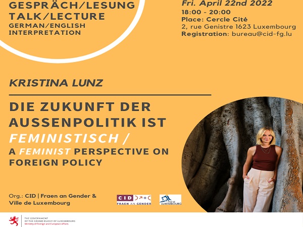 The CID Fraen an Gender information centre and the City of Luxembourg (Ville de Luxembourg - VdL) are organising, under the patronage of the Ministry of Foreign and European Affairs, an event with German activist and feminist Kristina Lunz at Cercle Cité in Luxembourg-Ville on Friday 22 April 2022, from 18:00 to 20:00.