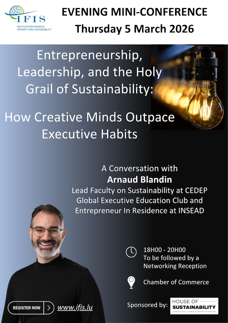 The Institute of Financial Integrity and Sustainability (IFIS) is organising a mini-conference featuring Arnaud Blandin, Lead Faculty on Sustainability at CEDEP Global Executive Education Club and Entrepreneur In Residence at INSEAD on Thursday 5 March 2026, at the Luxembourg Chamber of Commerce in Luxembourg-Kirchberg.