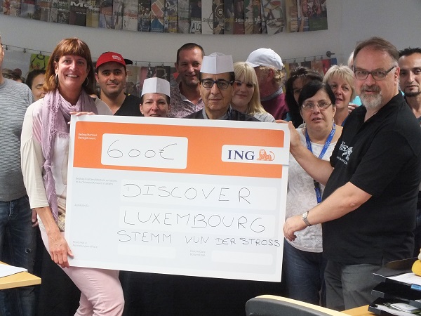 Event organiser Geoff Thompson presented a cheque for €600 to Alexandra Oxacelay, Director of Stëmm vun der Strooss, and her team, at theor premises in Hollerich.