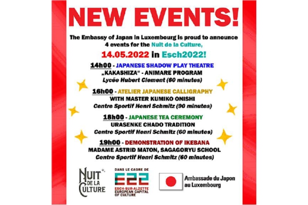 The Cultural Service of the Embassy of Japan has announced four cultural events on Saturday 14 May 2022, organised as part of the Esch2022 - European Capital of Culture Programme.