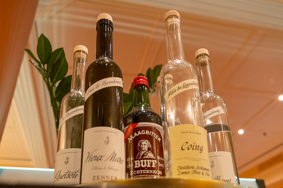 The wine list includes both Luxembourgish (Moselle, from Bernard-Massard) and French (from five different regions: Bordeaux, Rhône valley, Languedoc, Bourgogne and Provence) wines.