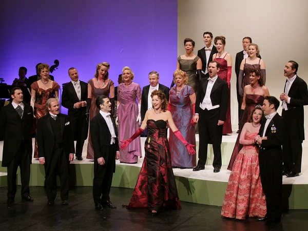 While the performances - acting, singing and dancing - in this professional production were outstanding, the production was made complete by both the costumes and the set design which enabled each scene to have a slightly different configuration. It needed very few props - a desk and telephone and a couple of chairs and some cushions and, of course, glasses of bubbly for the parties, but what set it apart was the projection of historical photographs on the curtains between scenes - something that was very clever technically and also fascinating for the audience.