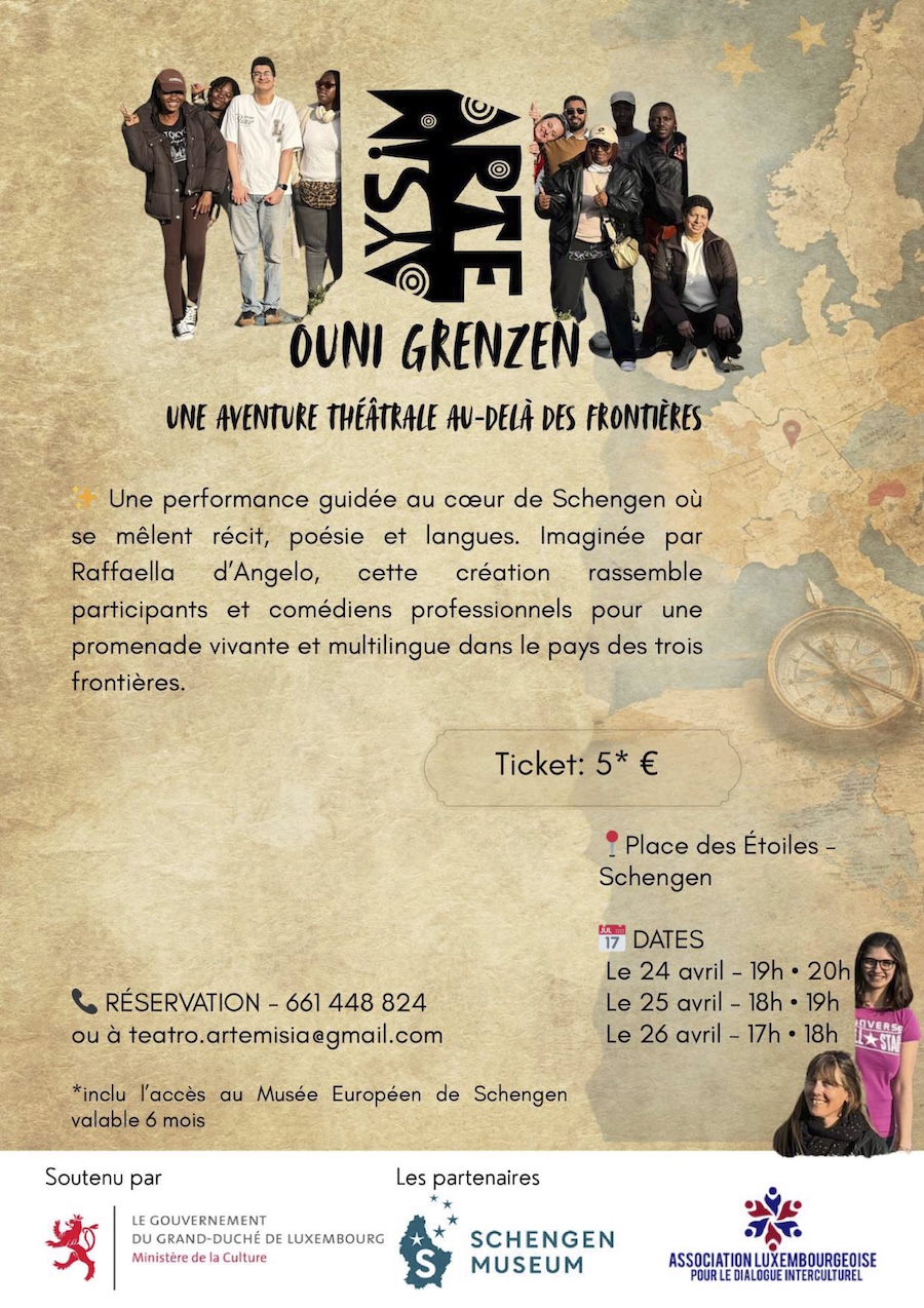 Luxembourg's Artemysia Theatre has announced it will host six performances of Ouni Grenzen (Without Borders), a guided theatrical tour in the heart of the three-borders region, at Place des Étoiles in Schengen across Friday 24, Saturday 25 and Sunday 26 April 2026.