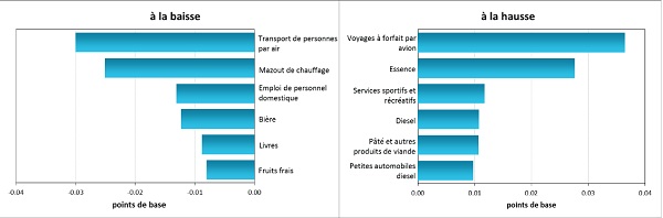 Prices of package holidays by air were up 1.4%, as were sports and recreational services, whilst diesel cars grew 0.2% compared with the previous month. Certain food products, such as meat and fish, experienced a similar rise of 0.2%, whilst beer and fresh fruit saw declines of 1.3% and 1.0%, respectively. Transport by air felt the largest price fall of -12.4%, whilst books decreased 1.4%.