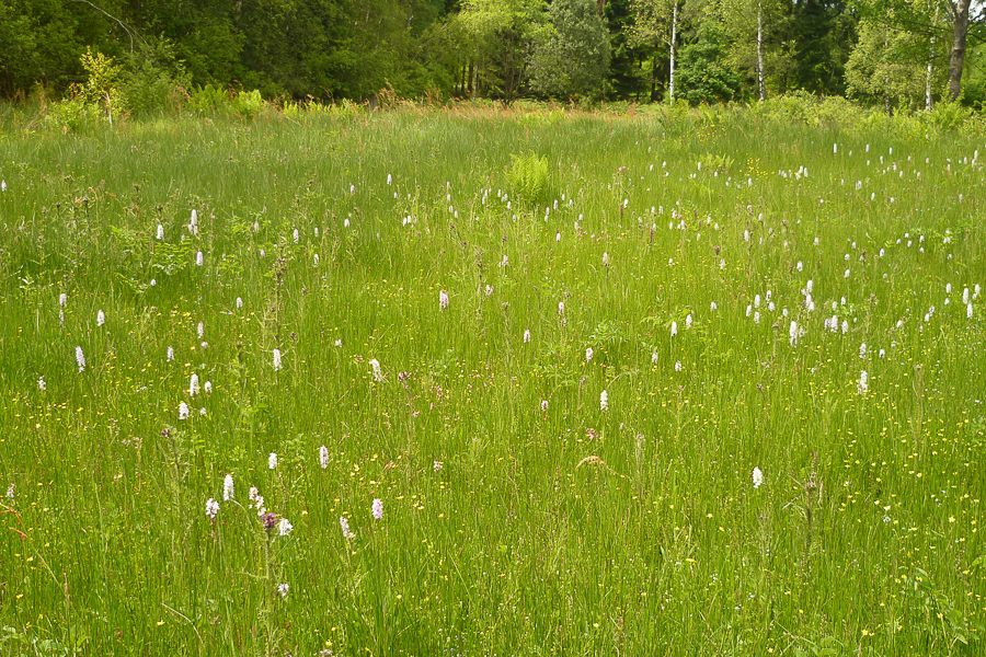The Nardus grasslands (Nardaies), often found on small mounds between two small streams, are highly fragmented in Luxembourg. Known for their floristic diversity, these meadows host the last vestiges of the Mountain Arnica (Arnica montana). Also known as "goat's hair," Mat-grass (Nardus stricta), a member of the Poaceae family, is recognisable by its slender, one-sided, very dark inflorescence and its erect, stiff and prickly leaves.