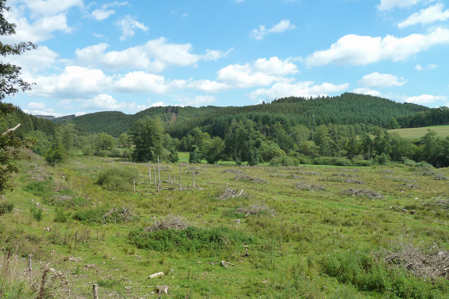 The left bank of the site remains a highly diverse typical mowing meadow, exhibiting characteristics of a lowland swamp. In stark contrast, the alluvial plain on the right bank was occupied by nearly five hectares of spruce forest. These conifers were ill-suited to the waterlogged ground, developing diseases like red rot. Furthermore, their shallow root systems promoted bank erosion and the needle litter impoverished the soil quality. To correct this inappropriate land use, the entire spruce plantation was deforested. The spruces were removed while strictly respecting the watercourses and maintaining the site's inherent wet character. The site has subsequently been converted into an open landscape, now managed through extensive grazing using Angus cattle, applied for a limited period annually, without fertilisers or pesticides.