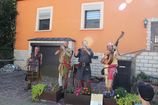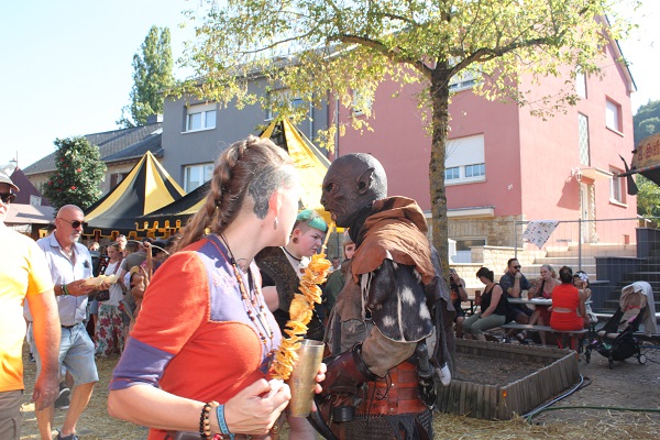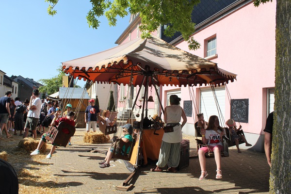 It was a hot, sunny day and the “Butschebuerger Buergfest” on Rue de la Chapelle drew visitors of all ages. There were over 90 merchants present, offering different wares such as medieval dresses, clothes and accessories, leather and silver jewellery, sheepskin rugs, drinking horns and staffs, but also beeswax products, lotions and potions (including incense). This year, there was even a stand for dog products and treats made of natural materials and ingredients (leather, etc.).