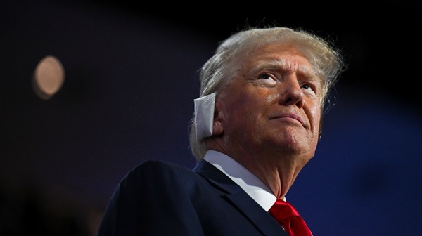 The former president walked into the Fiserv Forum in downtown Milwaukee to a loud response, his ear heavily bandaged from having been grazed by a bullet, hours after he was officially nominated to be the party's 2024 standard-bearer.